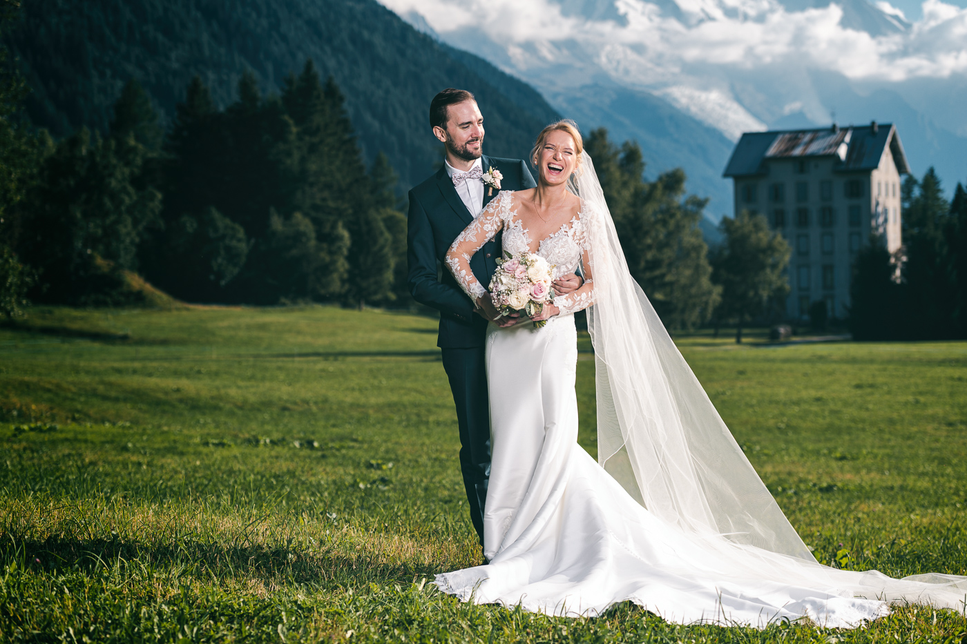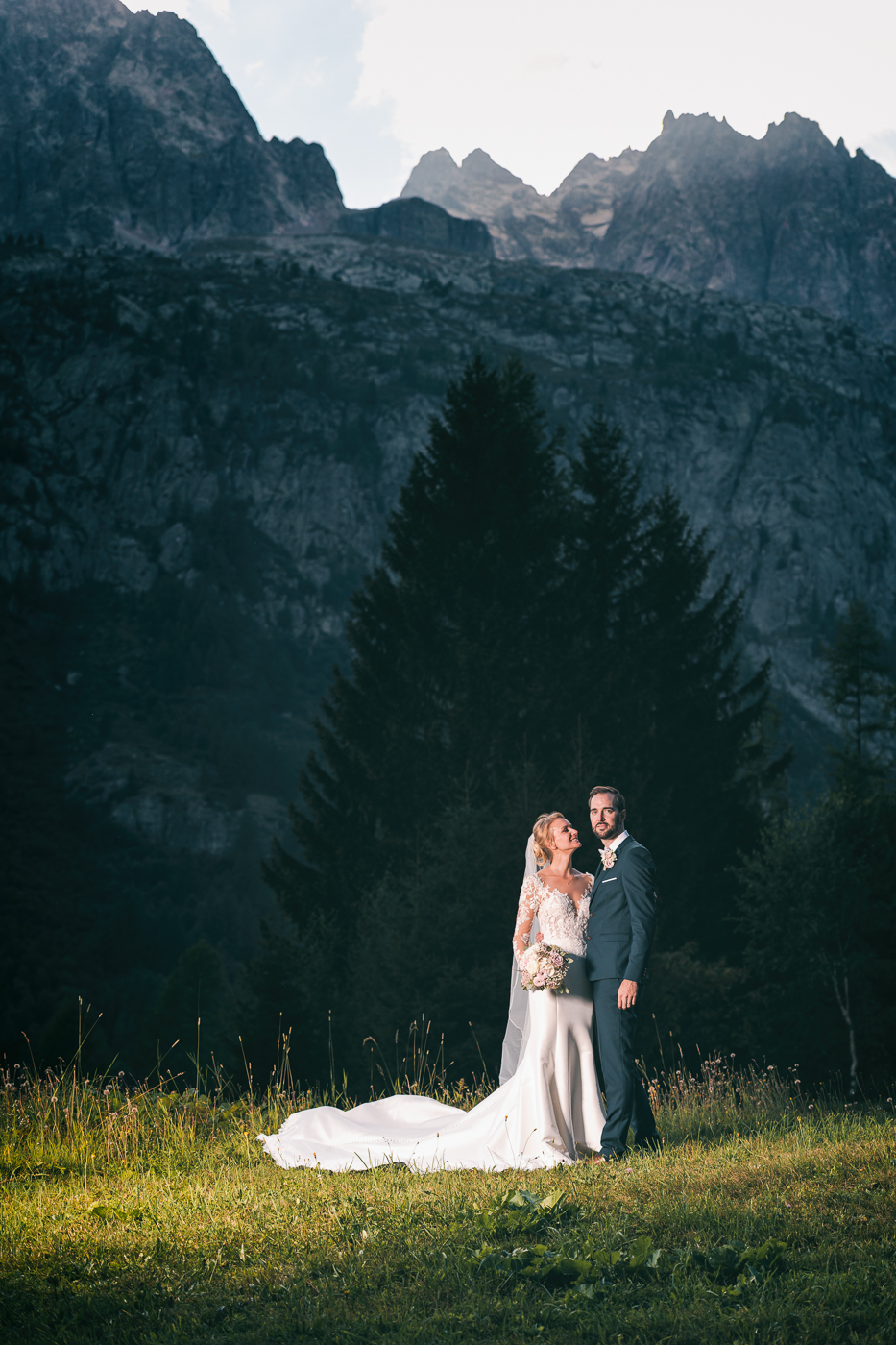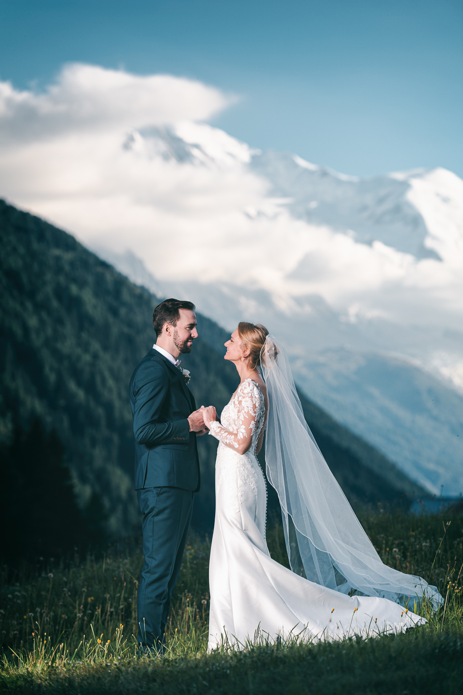 Après la cérémonie, nous avons profité d’un champ en pleine vallée de Chamonix, avec le Mont Blanc en toile de fond, pour une séance photo de couple unique. Ces paysages exceptionnels apportent une dimension poétique et intemporelle aux images. Les mariés ont vécu un moment suspendu, loin de l’agitation, permettant de créer des souvenirs authentiques et naturels.